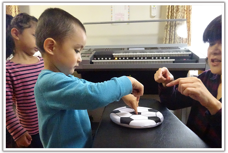 小さなお子様の場合は、最初から鍵盤を弾くのではなく、歌を歌ったり、リズムをたたいたり、リトミック的な要素が中心のレッスンです。